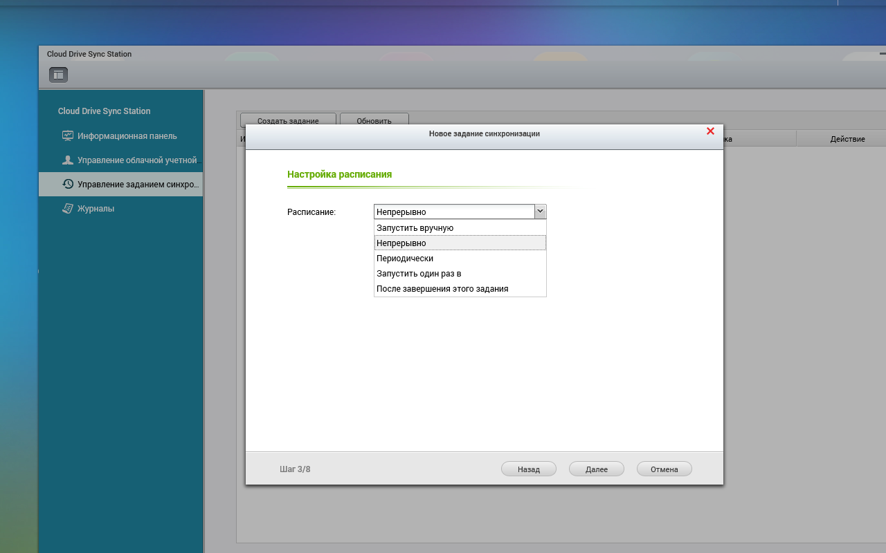 Если постоянная синхронизация не требуется, то можно выбрать и другой режим, включая расписание и однократный запуск.