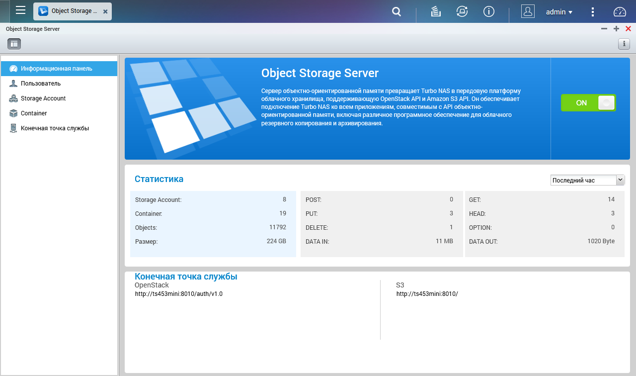 Вторая программа не менее интересна: это Object Storage Server (OSS), поддерживающий два API — S3 и OpenStack. Подробнее о работе с ней можно прочитать в статье на сайте производителя. Там же есть и список совместимых клиентов.