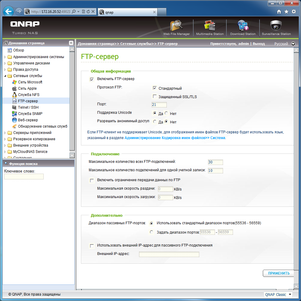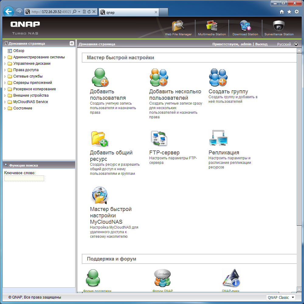 Основная работа по настройке накопителя осуществляется через веб-интерфейс. Он может работать по шифрованному соединению (HTTPS) и переведен на несколько языков, включая русский. Обеспечивается поддержка всех популярных браузеров.