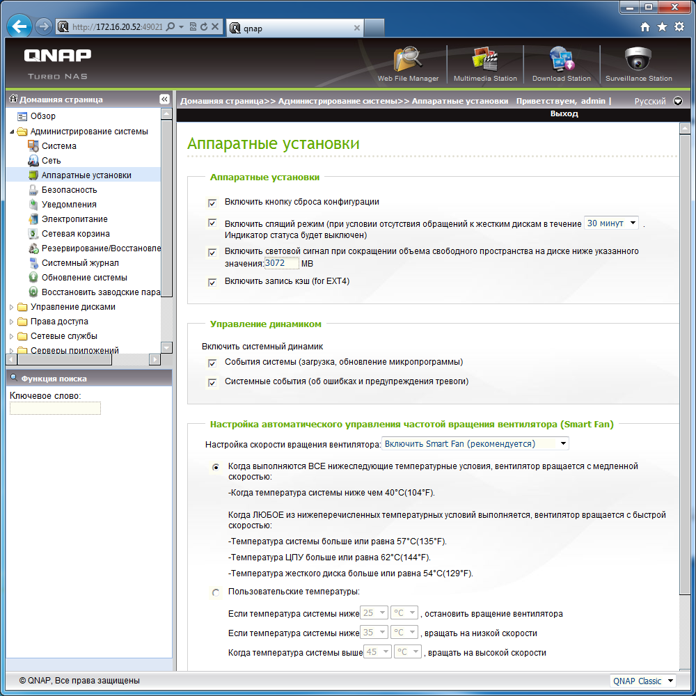 Пользователь имеет доступ к некоторым аппаратным настройкам — режимам управления вентилятором, звуковым сигналам. Есть достаточно большой набор опций для управления питанием — отключение дисков в случае отсутствия активности, установка расписания работы, поддержка WOL («Wake on LAN»).