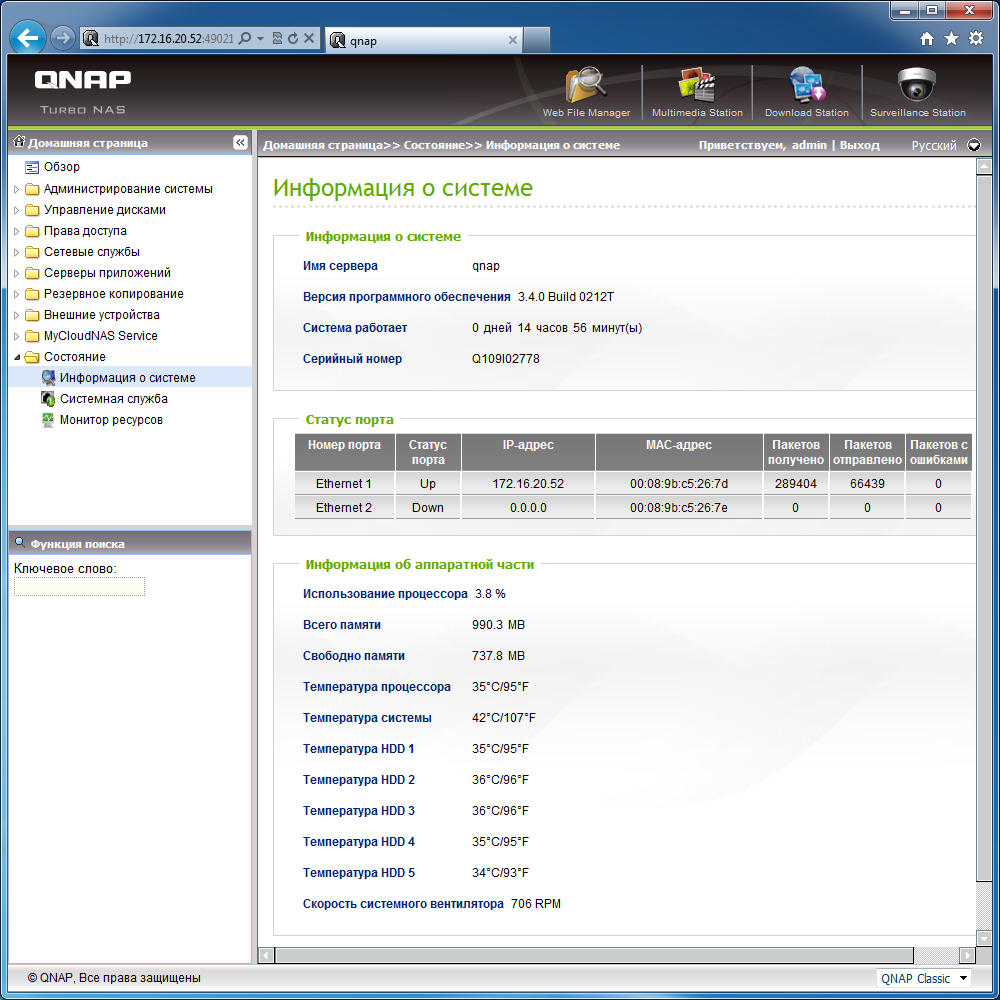 От этапа установки винчестеров, разумеется, никуда не деться — снимаем рамки, прикручиваем диски, возвращаем рамки на место. Устройство поддерживает крепление как обычных 3,5-дюймовых накопителей, так и 2,5-дюймовых винчестеров. Диски рекомендуется подбирать из списка совместимости, опубликованного на сайте производитея. Недавно в нем появились и модели объемом 3 ТБ. Явным плюсом многих последних моделей QNAP, в частности рассматриваемой TS-559 Pro+, является отсутствие необходимости установки прошивки на диски с использованием специализированного программного обеспечения. Она в запакованном виде хранится на встроенном флеш-диске и после первого включения с новыми винчестерами автоматически устанавливается на них. При желании пользователь может на этом этапе выбрать нужный режим массива для дисков, если их несколько. Так что ставим накопитель, включаем, ждем несколько минут — и уже можно работать. На экране устройства отображаются этапы установки, и в конце пользователь видит присвоенный DHCP-сервером IP-адрес, по которому может обратиться браузером для дальнейшей настройки.