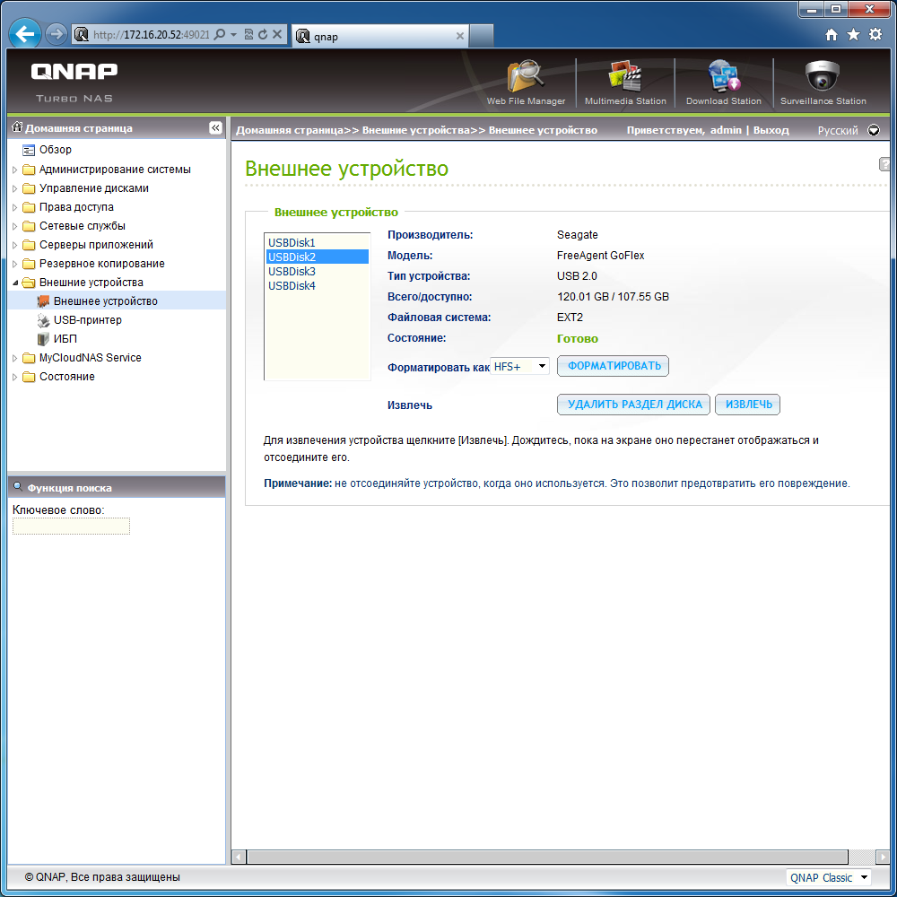 К сожалению, работа с USB-хабами не очень стабильна. Похоже, что их поддержка еще реализована не полностью. Из положительных сторон отметим поддержку нескольких разделов на дисках и всех популярных файловых систем (EXT2/3/4, FAT32, NTFS, HFS+), включая запись и возможность форматирования тома в них (кроме EXT2) прямо из интерфейса накопителя. Каждый том работает как отдельный сетевой ресурс. Пользователь может установить на него собственные права. Они запоминаются исключительно для имени вида «USBdiskN», а не действительно данного тома, что несколько затрудняет работу при переподключениях накопителей. Безопасное отключение дисков возможно через веб-интерфейс.