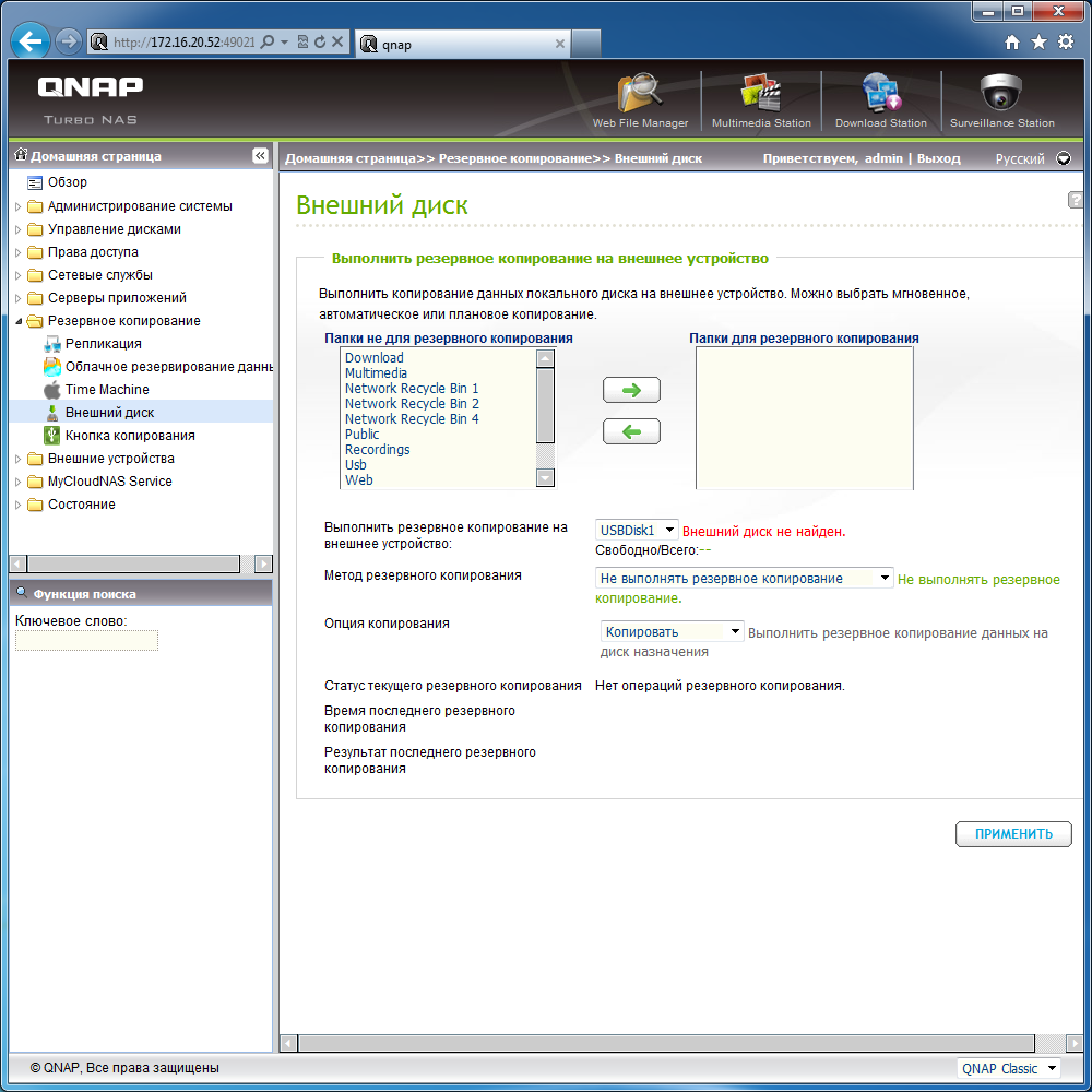 Вторая группа утилит касается резервного копирования. Накопитель может выступать в качестве сервера Rsync и RTRR (Real time remote replication — репликация ресурсов в реальном времени) для других устройств в сети. Аналогичным образом можно запрограммировать несколько заданий на самом накопителе для копирования данных с него по указанным протоколам. Есть и поддержка работы с удаленными серверами FTP. Кроме удаленных серверов, можно настроить копирование данных из одной папки в другую, в том числе и на внешний диск. Запускать задания можно в ручном режиме или же по расписанию. Недавно в прошивках QNAP появилась поддержка сервисов Amazon S3 и Elephantdrive. Для второго из них есть возможность использования 30-ти дневного пробного периода. Отдельно стоит упомянуть поддержку Time Machine для компьютеров с Mac OS.