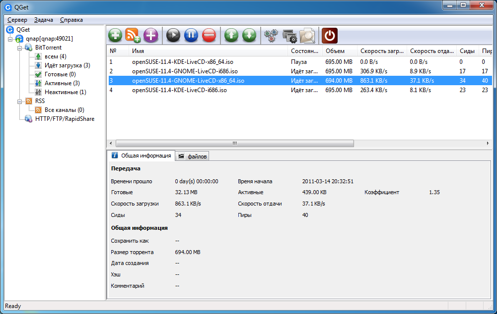 Не обошлось и без сервиса для автономной загрузки файлов по протоколам HTTP, FTP и BitTorrent. В новой версии прошивки изменился внешний вид страницы управления — она стала явно более понятной и простой. К сожалению, управлять загрузками может только администратор системы, что не очень удобно. Кроме веб-интерфейса можно использовать утилиту QGet, которая есть в версиях для Windows и для Mac OS X.