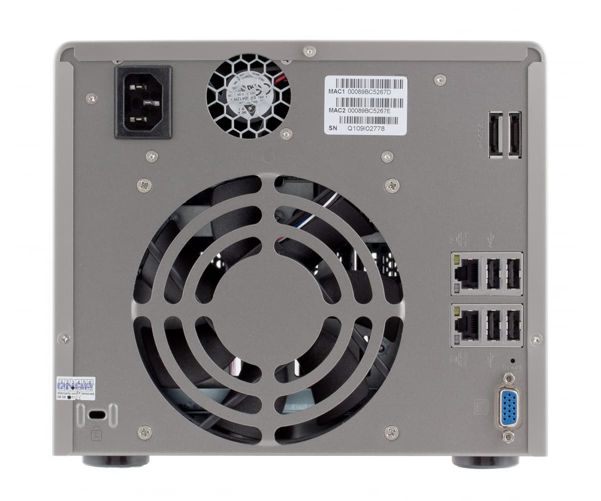 На задней панели расположен вентилятор основной системы охлаждения (120×25 мм), вход блока питания и его вентилятор (40×20 мм) и все порты ввода-вывода: два порта гигабитной сети, четыре порта USB 2.0, два порта eSATA и порт VGA. Есть и скрытая кнопка для сброса настроек.