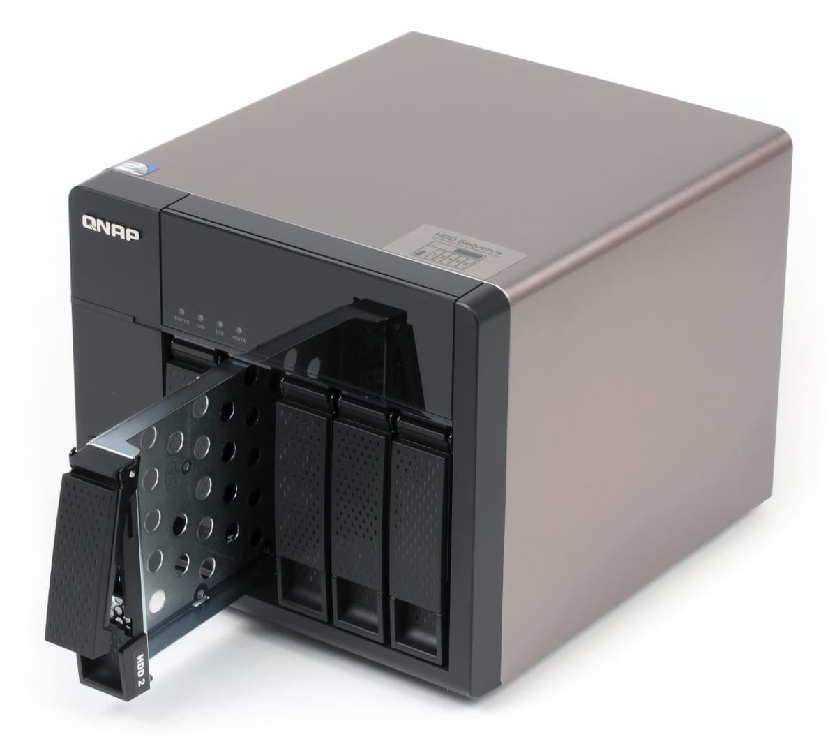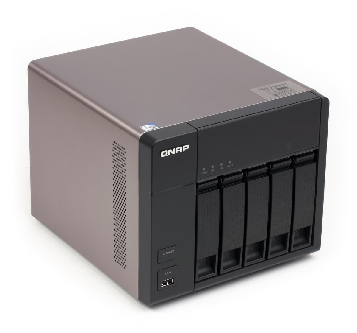 В этой статье мы рассмотрим модель TS-569L, которая имеет возможность установки пяти винчестеров, обладает интерфейсами USB 3.0 и eSATA и парой гигабитных сетевых портов. Она является представителем второго поколения пятидисковых моделей на Intel Atom и отличается от предшественников серии TS-559 в основном только процессором. Также стоит заметить, что суффикс «L» используется компанией для обозначения упрощенных моделей. В частности у TS-569L есть «старший брат», который обладает дополнительным дисковым контроллером для работы с SATA 6 Гбит/с, матричным дисплеем и замками на дисковых отсеках. На наш взгляд, существенным эти отличия назвать сложно. Интересно отметить, что в самой первой модели на пять отсеков — TS-509 Pro — использовался процессор Intel Celeron.