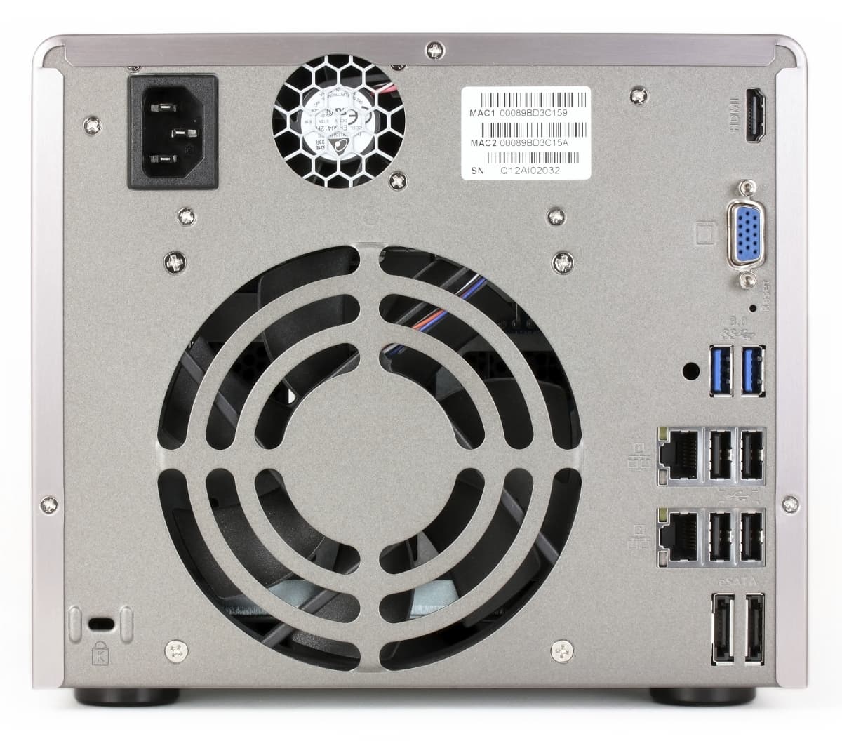 Сзади можно увидеть крупную решетку основного 120-миллиметрового вентилятора системы охлаждения, вход блока питания, его 40-миллиметровый вентилятор и многочисленные разъемы. Кроме двух сетевых гигабитных портов, пары eSATA и четырех USB 2.0 в рассматриваемой модели есть также два USB 3.0, VGA и HDMI. Последние могут использоваться для реализации функции медиаплеера. Также здесь находится скрытая кнопка сброса настроек и отверстие для кенсингтонского замка.