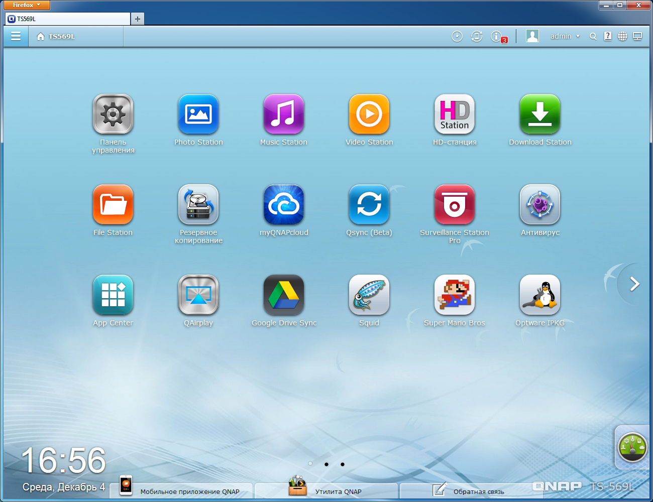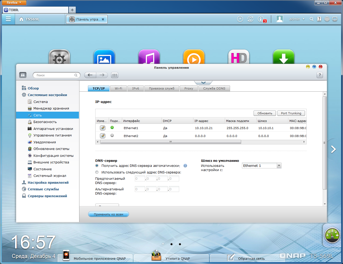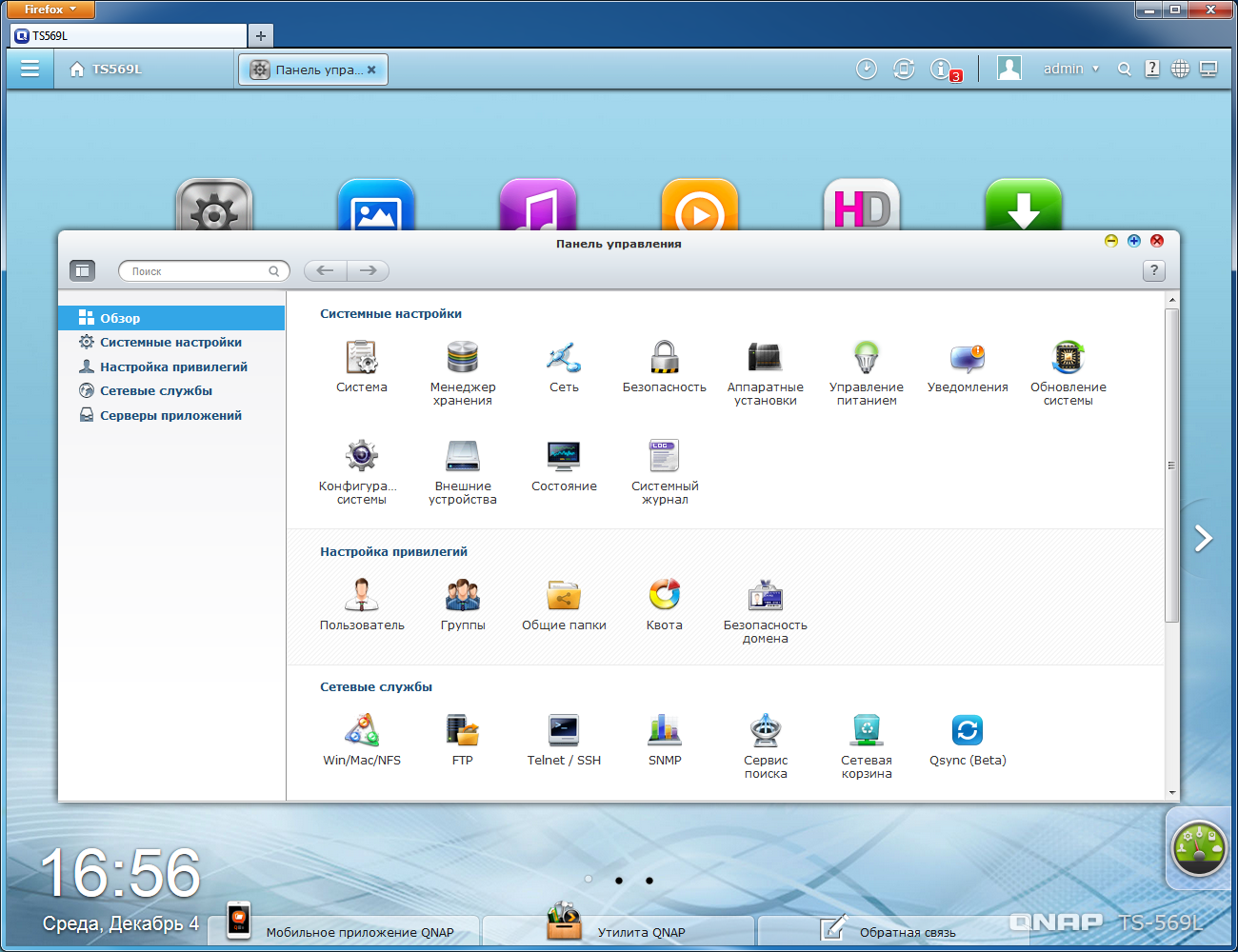 Версия 4.0 программного обеспечения QNAP существенно изменила как внешний вид, так и набор возможностей. Как мы уже упоминали выше, систему подобного уровня стоит считать скорее универсальным сервером, чем сетевым накопителем. Описание возможностей соответствует версии 4.0.5, загруженной с официального русского сайта.