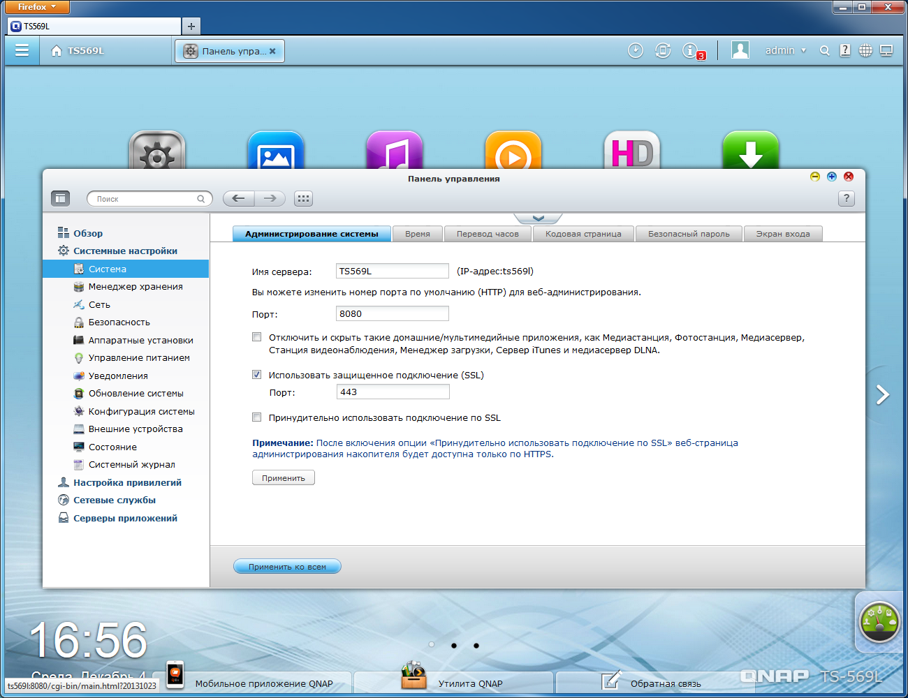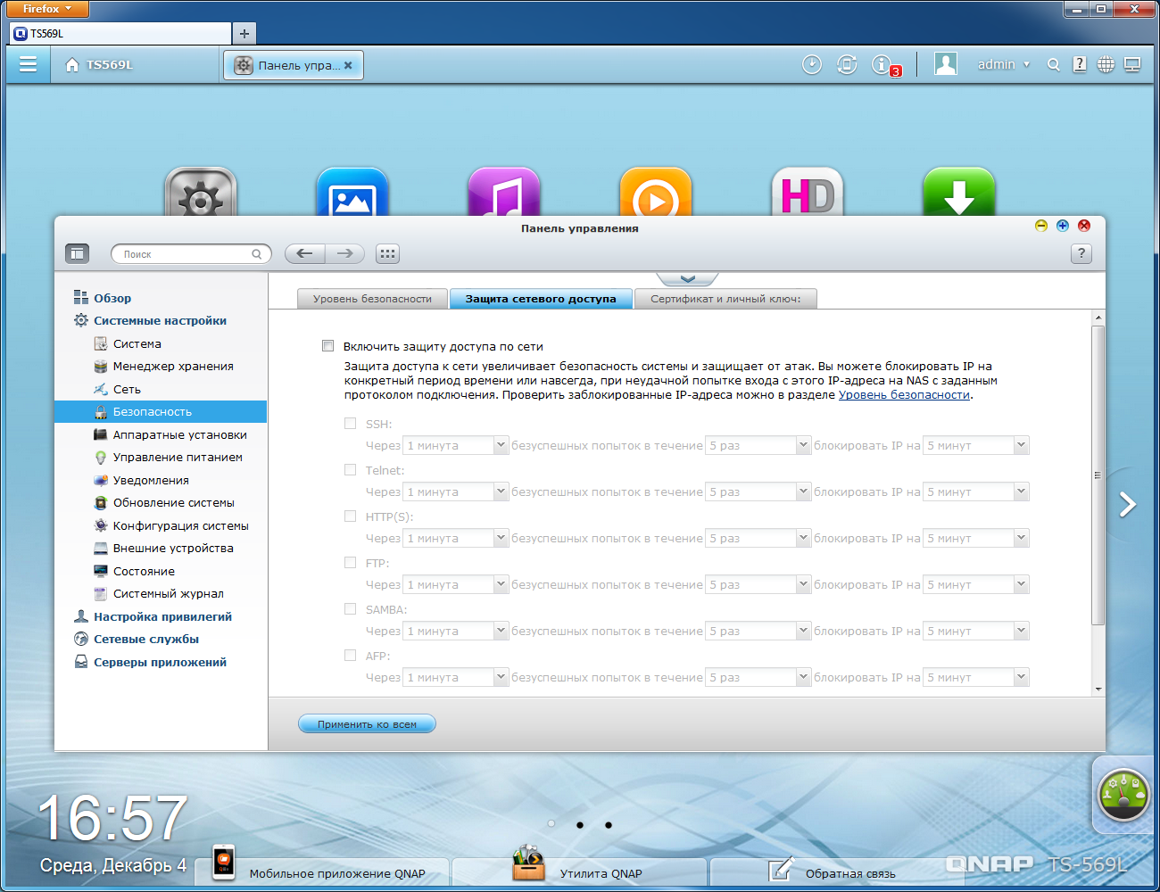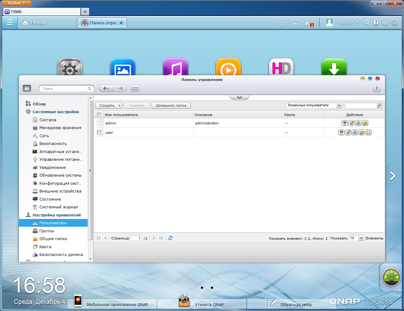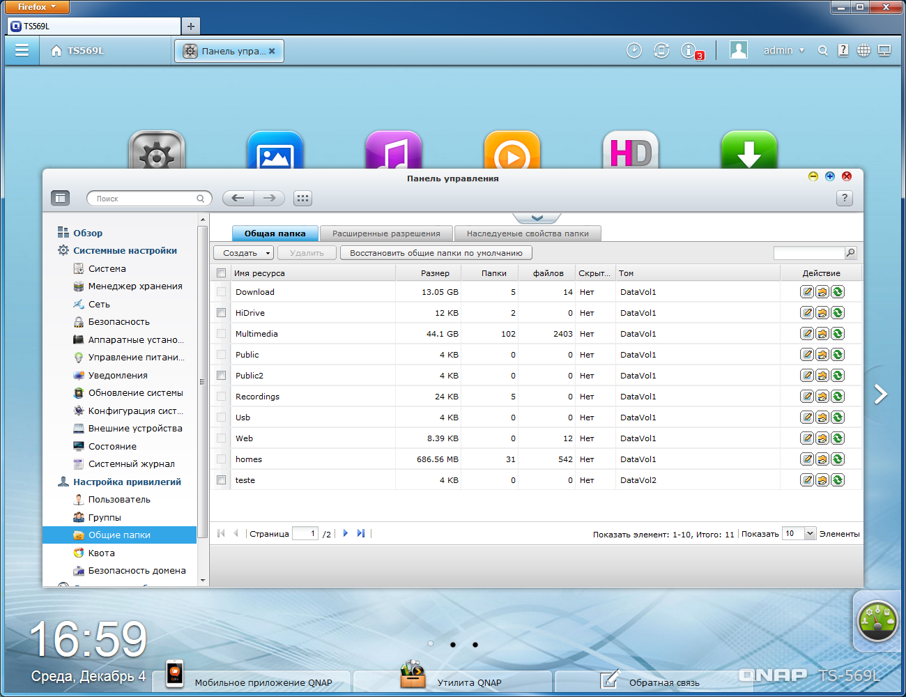 Версия 4.0 программного обеспечения QNAP существенно изменила как внешний вид, так и набор возможностей. Как мы уже упоминали выше, систему подобного уровня стоит считать скорее универсальным сервером, чем сетевым накопителем. Описание возможностей соответствует версии 4.0.5, загруженной с официального русского сайта.