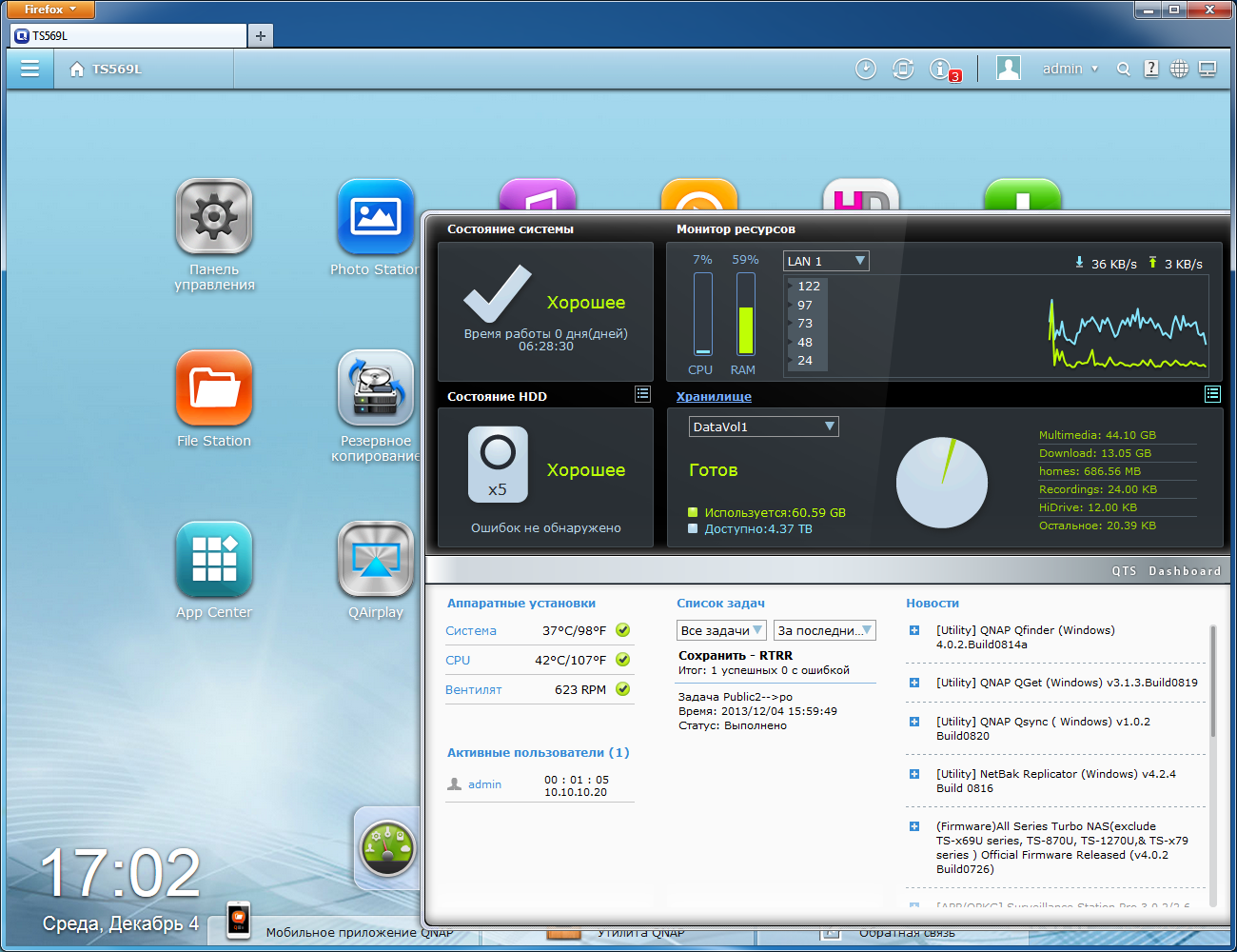Следить за состоянием устройства удобно через Dashboard на рабочем столе. В нем приводится информация о состоянии дисков и томов, монитор ресурсов, температуры и скорость вращения вентилятора, статус запрограммированных задач, подключенные пользователи, а также линейка новостей производителя. Есть в интерфейсе и отдельный модуль «Состояние». В нем в виде таблиц и графиков приводятся аналогичная, но более подробная информация.