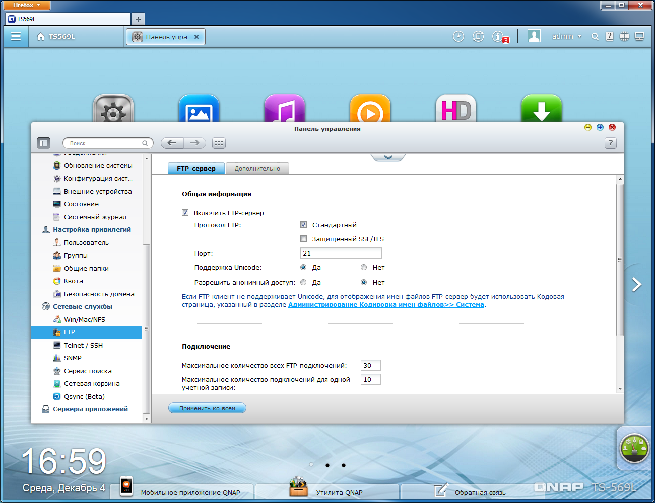 Сетевые накопители QNAP можно успешно использовать в гетерогенных сетевых конфигурациях благодаря поддержке широкого набора протоколов, включая SMB, AFP, NFS и FTP. Последний поддерживает Unicode, пассивный режим, изменение номеров портов и ограничение скорости.