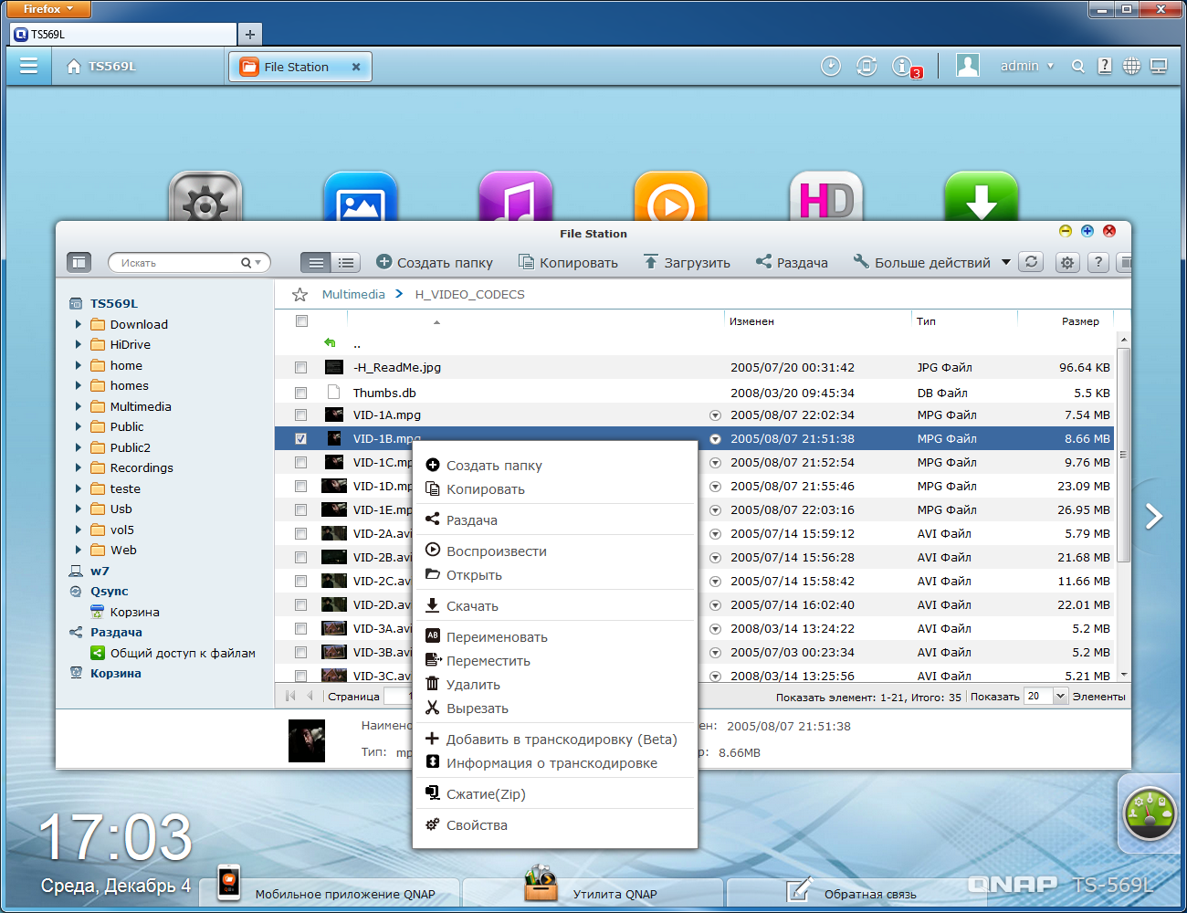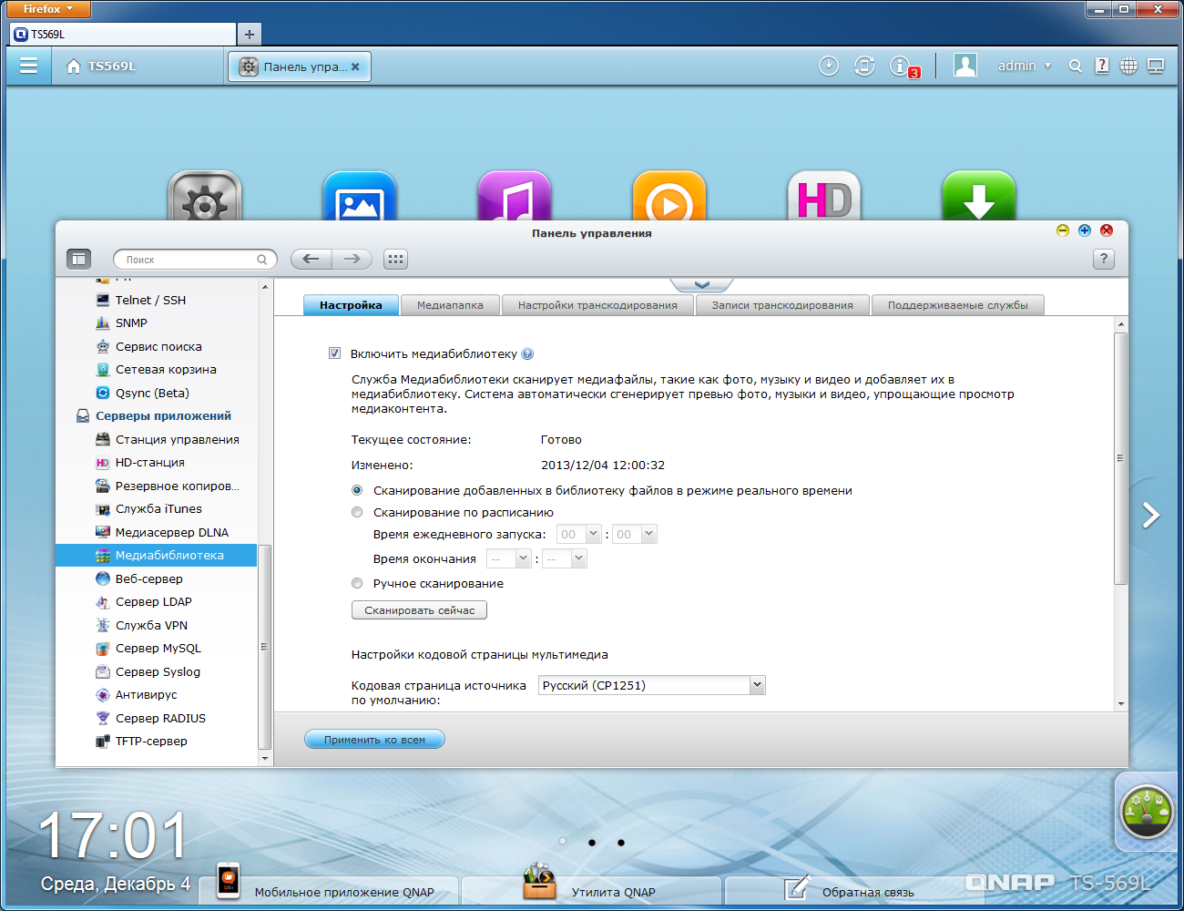 Ориентированные на работу с мультимедиафайлами сервисы опираются на модуль «Медиабиблиотека». Он отвечает за сканирование и индексацию данных этого типа в указанных пользователем папках. Недавно в нем появилась опция фонового транскодирования выбранных видеофайлов в форматы для мобильных устройств. Возможно, что в некоторых ситуациях это и пригодится, но надо отдавать себе отчет, что данная задача не является простой для установленной в накопителе платформе с точки зрения производительности. Данные этого модуля используются в дальнейшем при работе других серверов, в частности первого медиасервера DLNA, фото- и аудиокаталогов.