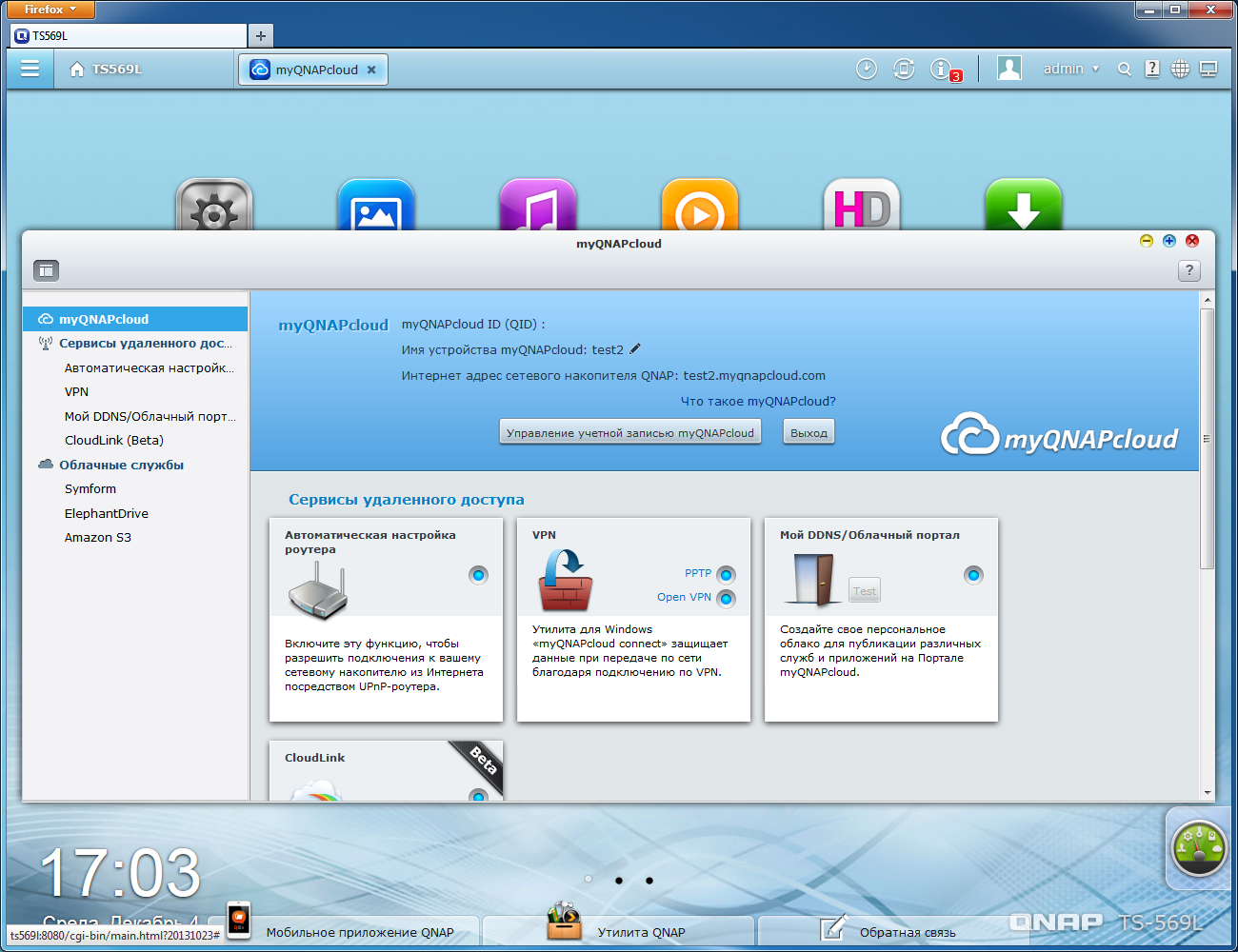 myQNAPcloud собрал в себе несколько возможностей для обеспечения простой настройки удаленного доступа к накопителю через интернет с компьютеров и мобильных устройств. В нем вы можете зарегистрировать имя устройства в собственной службе DDNS от QNAP, настроить UPnP-совместимый роутер для трансляции портов, получить доступ к данным и службам через специальный портал myQNAPcloud, настроить защищенный VPN-канал. Также была реализована функция CloudLink, которая позволяет обойтись без настройки трансляции портов роутера для удаленного доступа к системе.