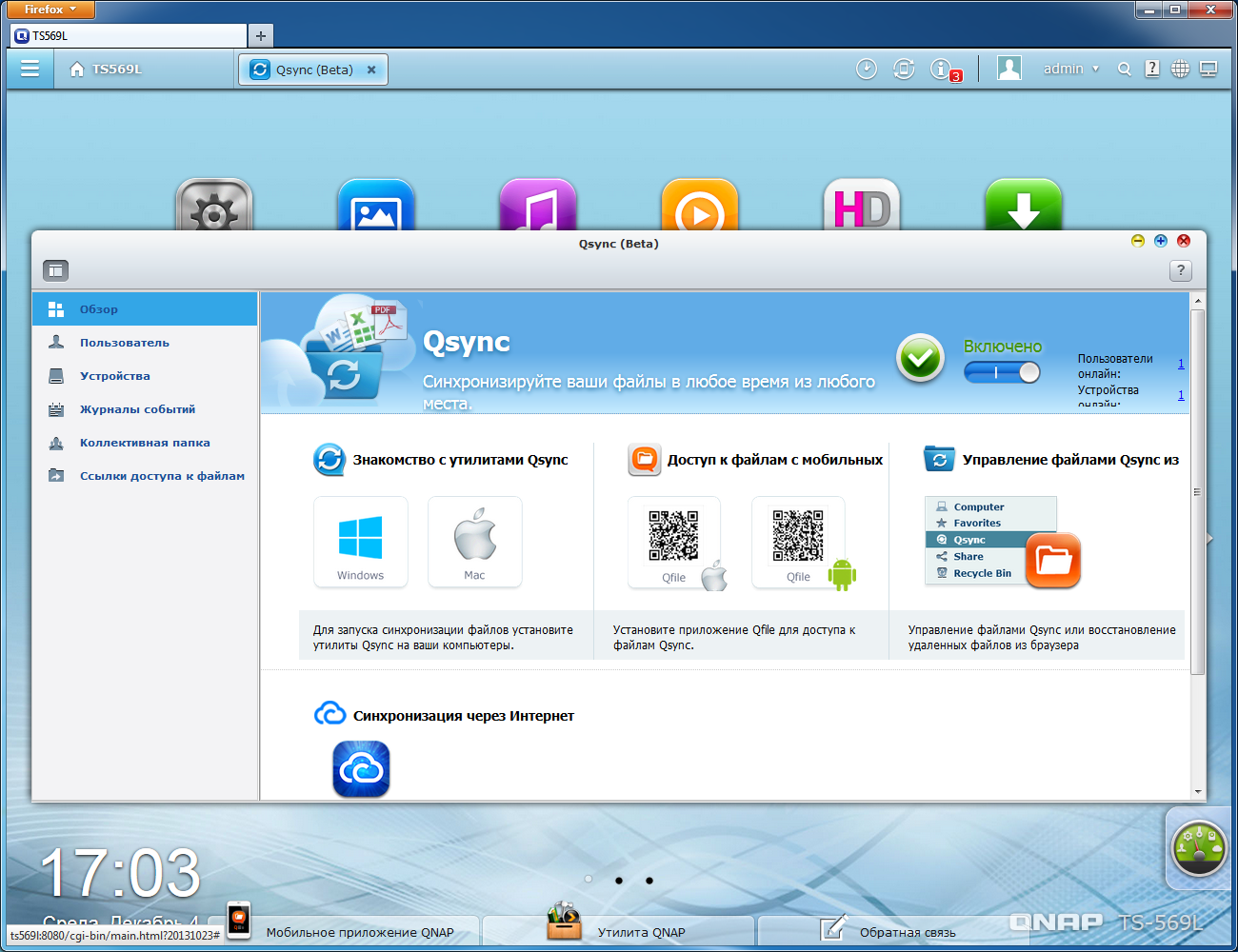 Сервис Qsync, находящийся в настоящее время в состоянии бета-версии, позволяет реализовать фоновую синхронизацию папки пользователя на сетевом накопителе и на компьютере. Правда, надо отметить, что доступ к данным в этой папке сетевого накопителя возможен только через Web-интерфейс. Никакие другие традиционные протоколы с ней не работают. Есть возможность предоставить полный доступ к части своих данных другим пользователям системы.