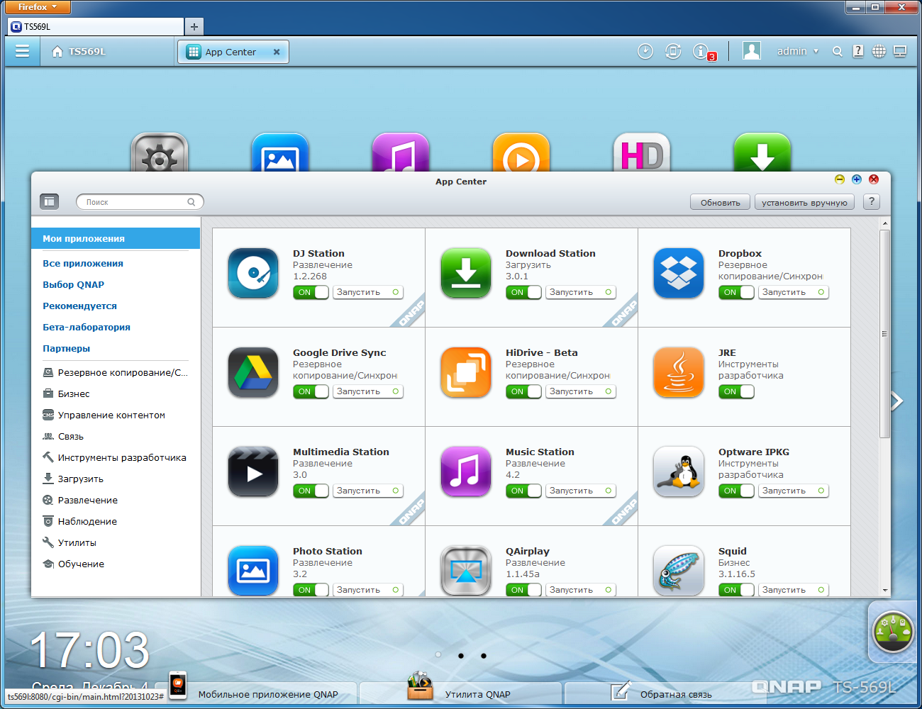 Управление дополнительными сервисами и установка новых пакетов осуществляется через пункт меню «App Center». Список автоматически фильтруется только для данной платформы NAS, и, кроме того, отсортирован по категориям. Общее число доступных в каталоге программ — более ста. Так что подробно рассмотреть все у нас не получится.