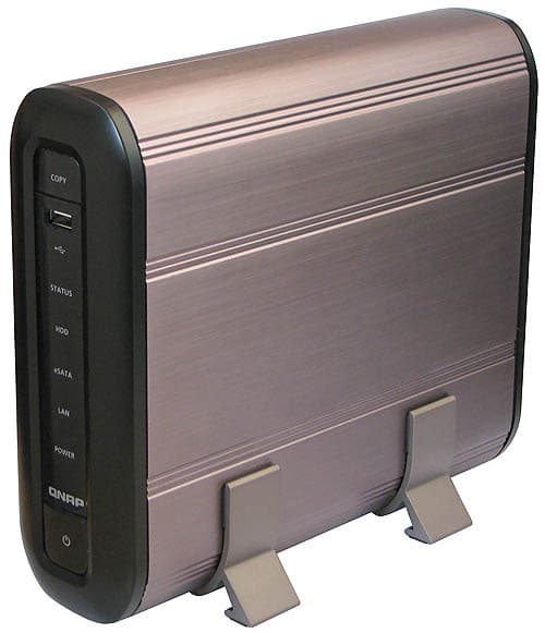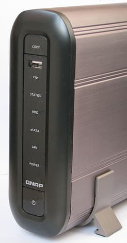 TS-109 Pro весьма красивый — округлые формы, темные пластмассовые торцы и тёмно-серебристый корпус добротного (не тонкого) алюминия. На переднем торце имеются ожидаемые индикаторы: POWER, LAN, eSATA, HDD, STATUS, кнопка питания и разъём USB с кнопкой COPY над ним. Во включённом состоянии индикаторы оказались разноцветными (красный, синий, зелёный, оранжевый) и очень приятных тонов. На заднем имеем: разъём eSATA, кнопку RESET, еще два разъёма USB, RJ45, разъём питания и отверстие под противоугонный тросик.