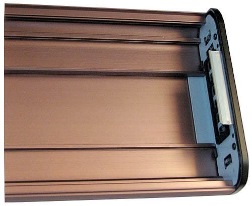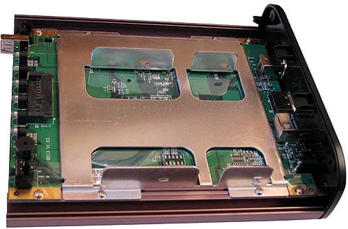 Сняв-сдвинув одну из массивных боковин из профилированного 2,5-мм анодированного алюминия, обнаруживаем крепление для винчестера, привинченное на системную плату размером с весь корпус: