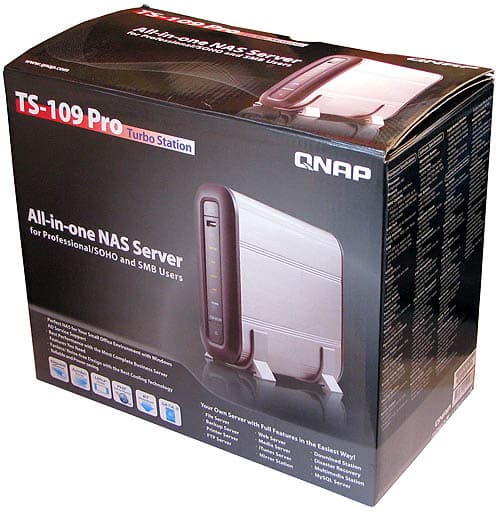 Итак, QNAP TS-109 Pro. Коробка выполнена из чёрного глянцевого картона. Так же, как и Synology, QNAP постаралась максимально информативно использовать его поверхность — здесь и виды основных применений устройства, и графики шума и производительности, и характеристики программного и аппаратного обеспечения.