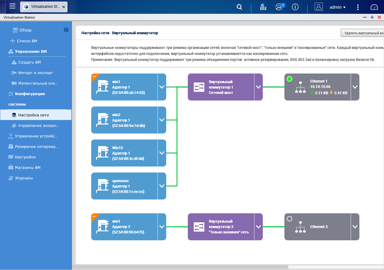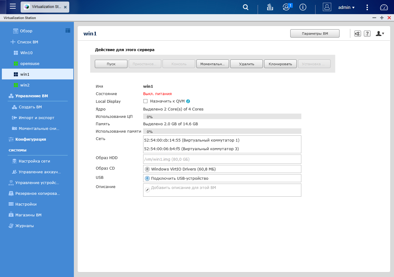 На странице «Обзор» вы видите информацию о текущей загрузке ресурсов сетевого накопителя, а также данные о виртуальных машинах и их активность. Здесь же предусмотрены кнопки управления ими. Отметим, что сервис имеет собственный журнал событий. В некоторых ситуациях может пригодиться поддержка автозапуска виртуальных машин при включении сетевого накопителя.