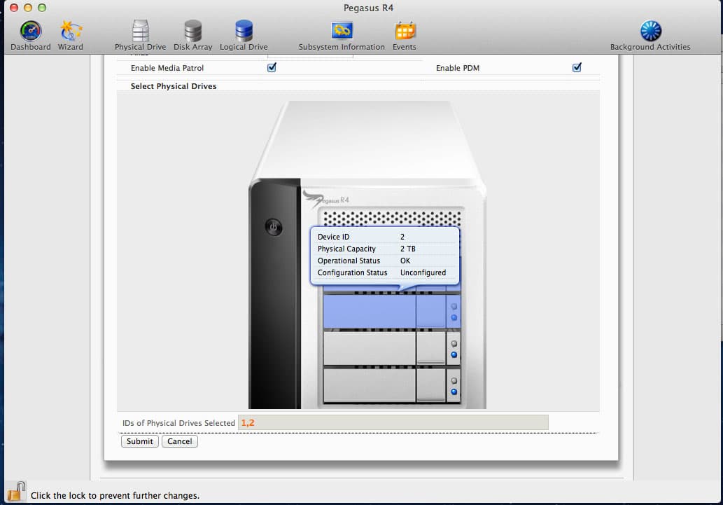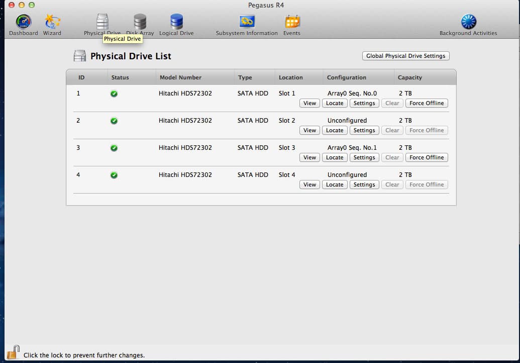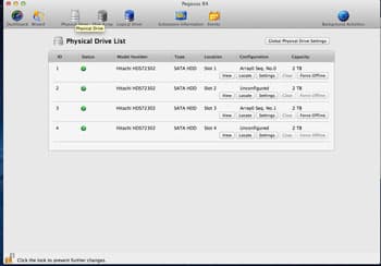 Так всё выглядит на нижнем уровне. Как видите, у нас есть четыре одинаковых диска, два из которых в данный момент объединены в массив, а два — несконфигурированы. При помощи этой закладки (Physical Drive) можно получить и более детальную информацию о каждом из винчестеров или, например, просто найти его в массиве — после нажатия кнопки «Locate» некоторое время будет мигать соответствующий светодиод на лицевой панели. Это может оказаться достаточно удобным, если вдруг возникнет желание поменять какой-нибудь из винчестеров на новый.