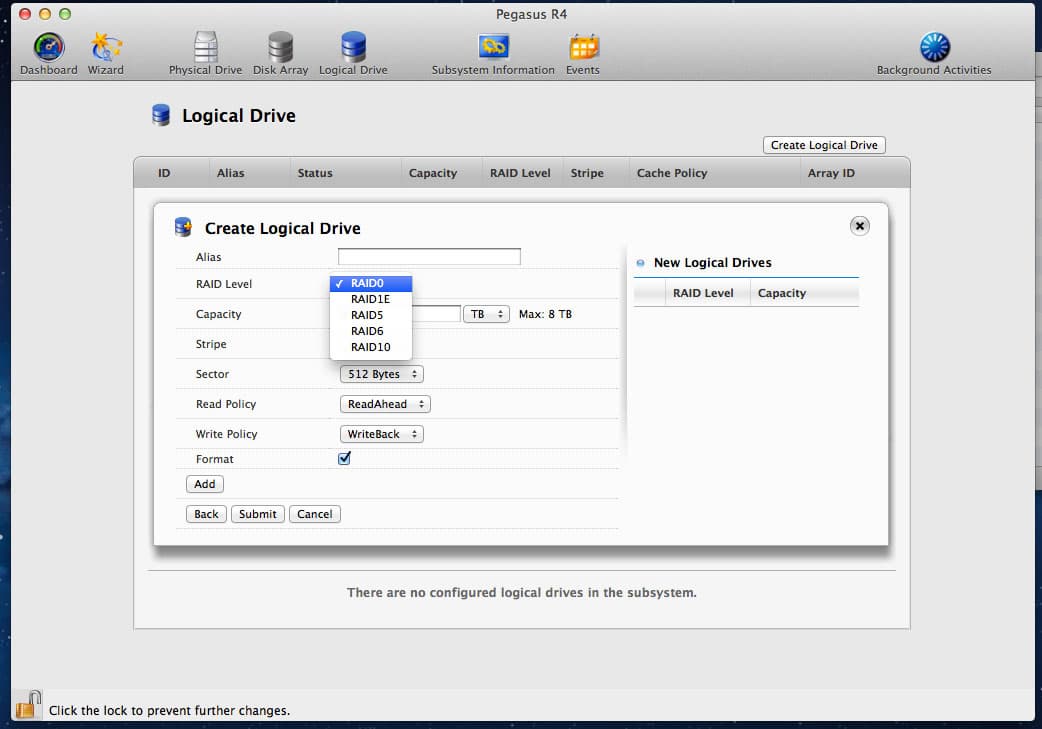 Но наиболее интересным является верхний уровень — логические диски. Собственно, как раз на этом уровне мы выбираем избыточность кодирования, размер блока, политики кэширования и тому подобное. В общем-то, совсем подробно разбирать возможности программы не требуется — достаточно того, что мы показали, что с ней можно управиться даже без документации. Главное — представлять, что именно вы хотите сделать.