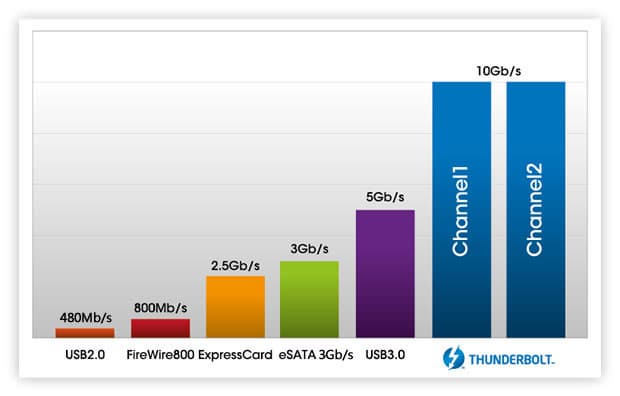 Чем это хорошо? Например, при переходе от PCIe 2.0 к 3.0 скорость, фактически, удвоится без необходимости серьезной переделки контроллера. Собственно, задача контроллеров относительно проста — «загнать» потоки в один единый на одном конце и «разделить» на другом, т. е. традиционное для ускорения PCIe увеличение тактовой частоты ложится в эту концепцию очень хорошо. А вот для USB нужно делать больше телодвижений — например, увеличение скорости при переходе от версии 2.0 к 3.0 привело к необходимости отказаться от полной совместимости и добавить дополнительные линии передачи данных. При этом, конечно, скорость удалось увеличить на порядок, но являются ли 5 Гбит/с серьезным запасом на будущее? Вряд ли, поскольку этого уже недостаточно для дискового массива из шести современных винчестеров, например. В то же время текущие реализации Thunderbolt позволяют получить 10 Гбит/с на порт при длине медного кабеля в 6 метров, а в перспективе у технологии освоение оптики и достижение скоростей в 100 Гбит/с.