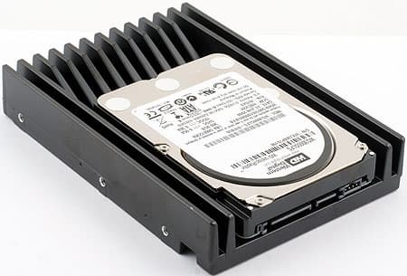 Но не это сильнее всего привлекало внимание пользователей, а очень уж непривычный внешний вид накопителя. Дело в том, что «Рапторы» первых трех поколений имели традиционный корпус — стандартный для 3.5 дюймовых винчестеров, так что о малом количестве пластин или уменьшенном диаметре последних можно было разве что прочитать в документации. А внешне — винчестер винчестером. VelociRaptor маскировку сбросил — сам по себе он сильно похож на ноутбучные модели (благо диаметр пластин тот же), но в полтора раза толще: мобильные винчестеры сильно теряют в производительности за счет компактной механики, здесь же на это идти было никак нельзя. Поэтому и пришлось сделать толщину накопителя равной 15 мм, что сделало его несовместимым с посадочными местами ни для мобильных накопителей, ни для настольных. Для решения последней проблемы компания придумала весьма оригинальное решение — специальный чехол IcePack, представляющий собой огромный металлический радиатор. Связка из VelociRaptor + IcePack имеет те же размеры а также дырки для крепежа, что и обычные настольные винчестеры. Кроме того, данная конструкция помогает обеспечить устройству качественное охлаждение. Предосторожность не лишняя — во время выполнения наиболее «тяжелых» тестов накопитель даже просто лежа на столе разогревается до весьма приличных (или неприличных) температур: порядка 50 градусов. В тесном и плохо вентилируемом корпусе ситуация может быть еще более плачевной, что приведет к преждевременному выходу накопителя из строя. А вот если вопросы охлаждение и крепления проработать, можно от IcePack и отказаться. Версия накопителя, имеющая маркировку WD3000BLFS (а не WD3000GLFS как нами протестированная), его как раз и лишена.