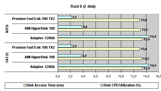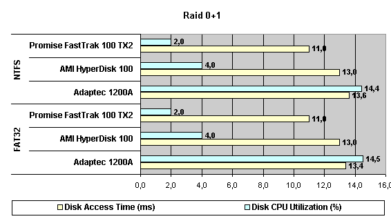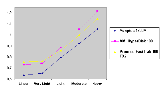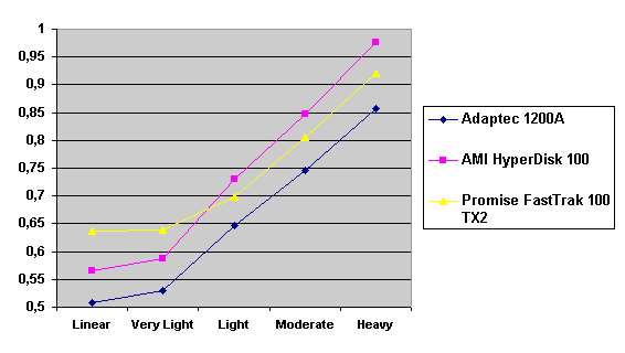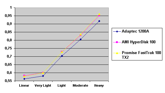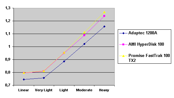 Опять-таки, сколь-нибудь заметного увеличения загрузки процессора не произошло. Время доступа уменьшилось у всех контроллеров, кроме Adaptec.