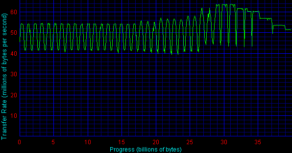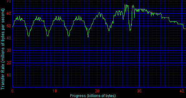 Картинки стали гораздо интереснее :). Все контроллеры стремятся поддерживать постоянную скорость линейного чтения. Adaptec, как всегда, выделился абсолютно ровным графиком. Но скорость, скорость!!! Остальные два контроллера показывают приблизительно одинаковую минимальную скорость чтения на каждом участке, хотя график AMI мне лично нравится больше.