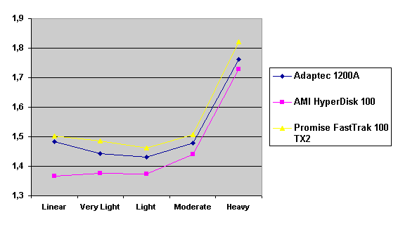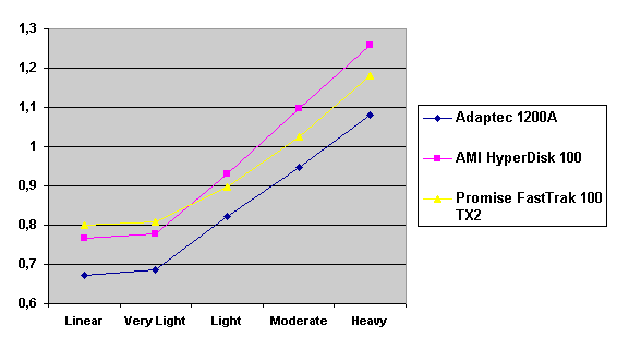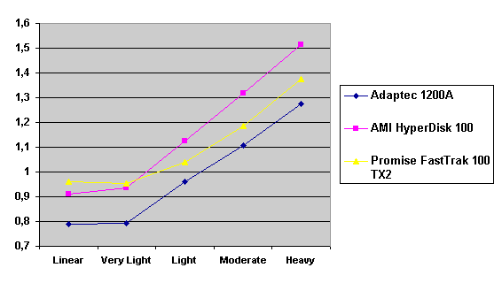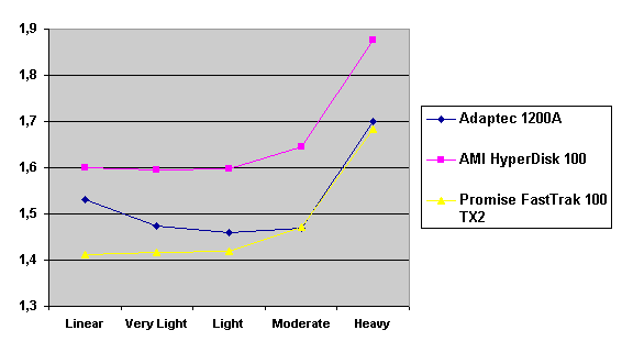 Заметно некоторое снижение результатов Promise и рост результатов Adaptec и AMI при больших нагрузках.