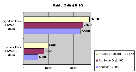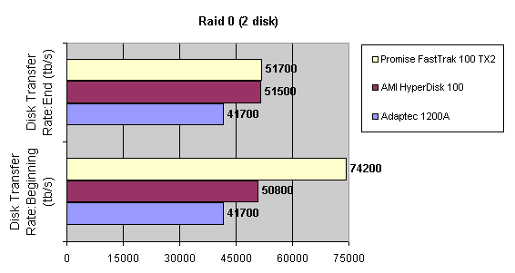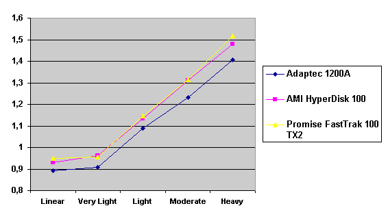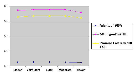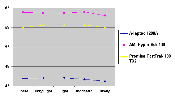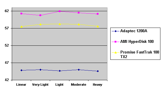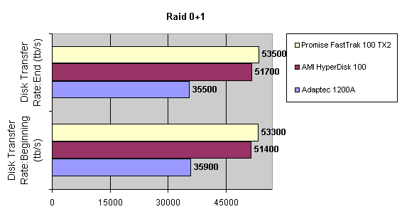 Тестирование контроллеров на данном уровне RAID не выявило явного победителя. AMI Hyperdisk100 и Promise FastTrak100 TX2 пришли к финишу почти вровень. У каждого контроллера есть свои преимущества. Adaptec 1200A, как и в других случаях, показал идеальный график чтения, но при этом, на мой взгляд, недостаточную скорость.