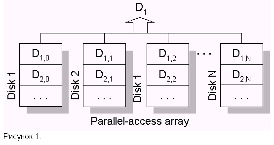 Если расположить блок данных по N дискам некоторого массива и организовать это размещение так, чтобы существовала возможность одновременного считывания информации, то этот блок можно будет считать в N раз быстрее, (без учёта времени формирования блока). Поскольку все данные передаются параллельно, это архитектурное решение называется parallel-access array (массив с параллельным доступом).