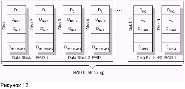 Эта архитектура являет собой массив типа RAID 0, сегментами которого являются массивы RAID 1. Он объединяет в себе очень высокую отказоустойчивость и производительность.