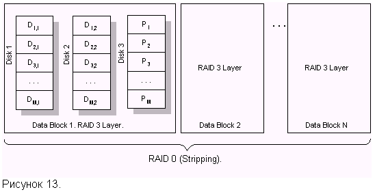 Представляет собой массив типа RAID 0, сегментами которого являются массивы RAID 3. Он объединяет в себе отказоустойчивость и высокую производительность. Обычно используется для приложений требующих последовательной передачи данных больших объемов.