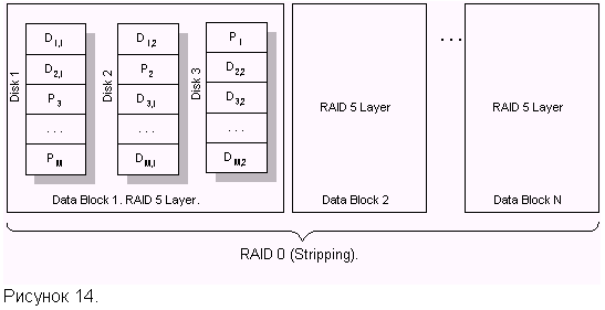 Являет собой массив типа RAID 0, сегментами которого являются массивы RAID 5. Он объединяет в себе отказоустойчивость и высокую производительность для приложений с большой интенсивностью запросов и высокую скорость передачи данных.