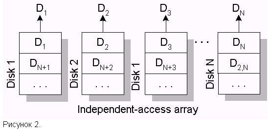 Некоторые задачи, наоборот, характерны большим количеством малых запросов. К таким задачам относятся, например, задачи обработки баз данных. Располагая записи базы данных по дискам массива, можно распределить загрузку, независимо позиционируя диски. Такую архитектуру принято называть independent-access array (массив с независимым доступом).