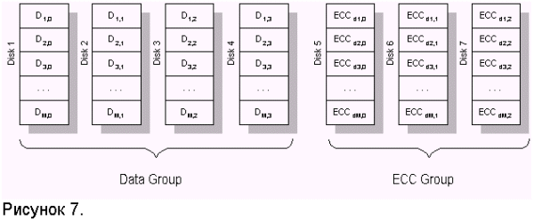 В данном случае показан пример с фиксированным количеством дисков в связи с громоздкостью описания (слово данных состоит из 4 бит, соответственно ECC код из 3-х).