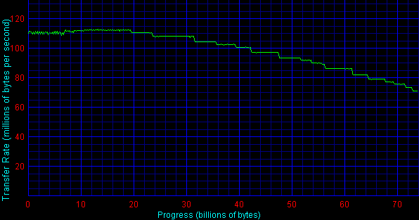 Ах вот оно что! Просто-напросто контроллер Iwill IS150 предназначен для классической PCI 32bit/33MHz, дающей максимальную (читай, недостижимую в реальных условиях) пропускную способность (32bit/8)*33MHz = 133 MB/sec. Таким образом, практически на всем протяжении графика скорости линейного чтения (точнее, на первых 120 из 148 GB массива) эта самая скорость чтения ограничивается пропускной способностью шины. Кстати, то же самое, но в меньших масштабах — на первых 20GB, можно наблюдать и для RAID0-массива двух WD360GD. Это объясняет, почему на верхнем графике «Disk Transfer Rate» скорость чтения в конце массива в два раза превосходит скорость чтения в конце отдельного диска, а для значений скоростей, полученных на начале диска/массива, это правило не работает.