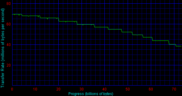 Диск продолжает выдавать блестящие результаты. Помимо уже продемонстрированного общего первого места по скорости линейного чтения, новинка показывает замечательную «стайерскую выносливость» — первая ощутимая ступенька падения скорости линейного чтения приходится на 21-23GB, вторая — на 39-40GB (это больше половины диска), до 39GB скорость падает лишь на 3MB/sec, что является редким и приятным результатом. (Насколько я помню, из последних дисков только SCSI-пятнадцатитысячник Fujitsu MAS53367NC c вчетверо меньшим размером мог похвастаться подобной стабильностью линейного чтения до половины своего размера).