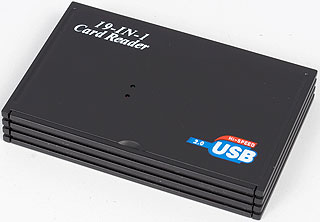 Открывает наш парад классика продукции «скромных» производителей, не рвущихся к известности. Единственной интересной особенностью данного устройства можно считать крышку, которая, по замыслу конструкторов, при транспортировке устройства должна закрывать слоты от попадания мусора (подобная была у Lexar Multi-Card Reader). В остальном ничего нового — давно привычная прямоугольная коробочка с четырьмя слотами для всех основных типов карт памяти, за исключением их компактных модификаций, да USB-разъем типа mini-B на противоположной грани.