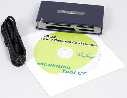 Согласно утверждениям Apacer, данный картовод поддерживает 23 типа карт. Как получаются все эти дикие количества, я в свое время писал. Как видим, даже крупные фирмы гонка за попугаями не миновала. Да и не могла она их миновать — можно честно написать нечто типа «12 in 1», но попробуйте потом продать это, если рядом лежит внешне неотличимое, но вдвое более дешевое устройство, на котором написано «40 in 1». Поэтому гонка виртуальных вооружений будет продолжаться и дальше. И использоваться в ней будут все средства.