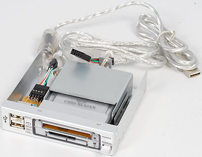 Сам картовод невелик, так что легко поместится, например, в карман рубашки. Снабжен двумя слотами, чего все равно достаточно (благодаря их конструкции) для поддержки всех современных типов флэш-карт. Кое-чем, конечно, придется жертвовать — в данном случае прямой совместимостью с картами уменьшенных размеров: их придется использовать совместно с переходниками, но тут ничего не поделаешь. Сзади расположен поворотный USB-разъем, что при подключении к компьютеру позволяет обойтись без кабелей. А рядом с ним еще один разъем USB, но уже B-типа. Зачем он нужен? Через него осуществляется контакт с доком, устанавливаемым в свободный отсек для 3,5-дюймовых накопителей. Чудесное решение! При стационарном использовании никаких проводов, никаких коробок на столе — полноценное внутреннее устройство. Нужно его взять с собой? Нажимаем кнопку и получаем достаточно компактный мультиформатник, который можно подключить к любому компьютеру.