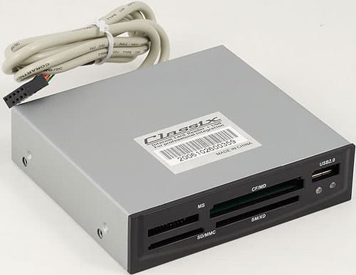 На фотографии также хорошо виден USB-разъем: стандартный 9-ти контактный для подключения к материнским платам. Монолитный, так что проблем с подключения устройства, скорее всего, не будет. Если только попадется старая плата с нестандартным разъемом, но там обычно будет и USB-контроллер, лишь отвечающий спецификациям USB 1.1, так что все равно не имеет смысла использовать в данном случае высокоскоростной (пусть относительно) картовод.