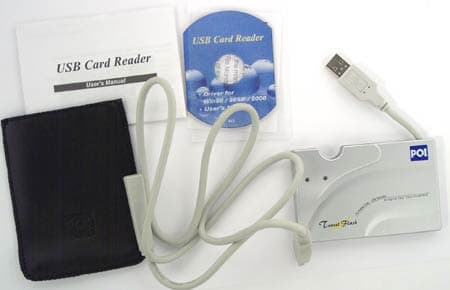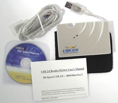 Сам по себе картовод очень компактен — брусочек размерами 63×98×11 мм, что позволяет носить его в кармане. С одной стороны закреплен короткий USB-кабель, который можно упрятать в корпус. Для удобства подключения в комплекте имеется нестандартный USB-удлинитель (форма розетки позволяет использовать его лишь с устройствами линейки Travel Flash). В комплект также входят CD-визитка с драйверами для Windows 98, обновлением драйверов для Win2000 (хотя устройство прекрасно работает и без оного, а под МЕ и ХР драйверы не нужны и официально) и руководством пользователя, чехол из кожзаменителя и краткая печатная инструкция. Все это упаковано в небольшую картонную коробку.