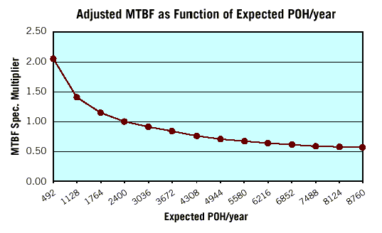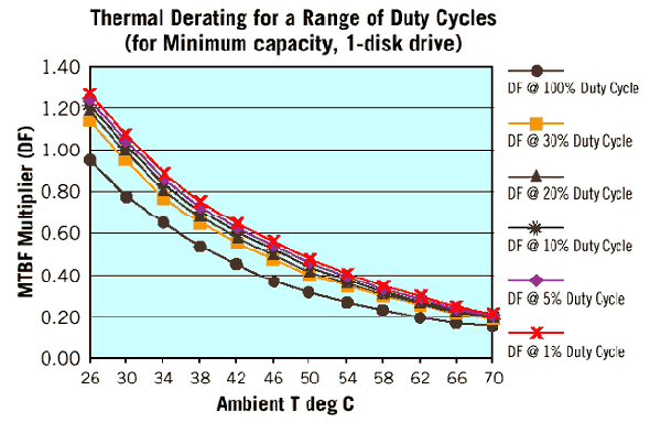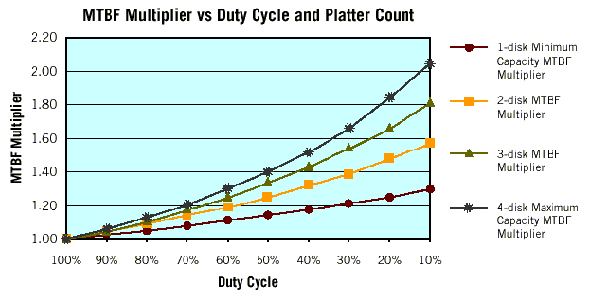 Например, если известна наработка на отказ для 2 400 рабочих часов в год, а реальное рабочее время за год составляет 8 760 часов, то среднее время наработки на отказ снизится примерно вдвое. И наоборот: когда накопитель работает мало, как это бывает в некоторых игровых видеоприставках, то наработка на отказ может почти удвоиться.