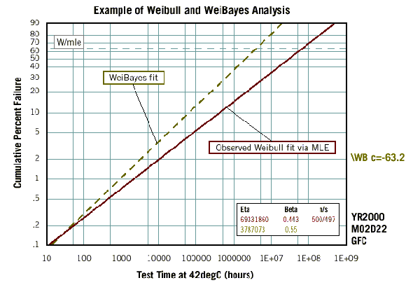 Результаты, полученные методом WeiBayes (для бета = 0,55), представлены на графике пунктирной линией. Поскольку 672 часа работы при температуре 42°С для испытания RDT вполне достаточно, мы использовали свой внутренний параметр «доверительная вероятность прекращения испытаний»4, который для анализа WeiBayes принят равным 63,2%. Расчет по методу WeiBayes показал, что при температуре 42°С и статистическом значении бета = 0,55 приемлемое значение эта составляет 3 787 073 часа.