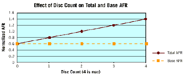 Чтобы определить, как изменяется наработка на отказ при продолжительности включения 2,5% по сравнению со 100% (такое значение характерно для испытаний RDT), нужно выяснить, какое влияние на этот процесс оказывают те компоненты накопителей, состояние которых зависит от продолжительности включения, а какое — другие его элементы. Количество зависимых компонентов в накопителе прямо пропорционально количеству пластин жестких дисков в нем. Взаимоотношение между числом жестких дисков и усредненной интенсивности отказов за первый год отображено на следующей иллюстрации. Пространство под пунктирной линией на этом графике соответствует «базовой», — то есть, не зависящей от того, как долго работает устройство, — интенсивности отказов гипотетического накопителя с нулевым количеством жестких дисков (или накопителя, который не производит чтения, записи и поиска информации). Сплошной линией отмечена ожидаемая интенсивность отказов как функция количества жестких дисков.