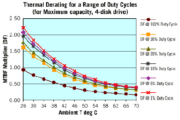 Проведенные расчеты показывают, что для оценки среднего времени наработки на отказ за три года эксплуатации дисковода нужно умножить исходный показатель за первый год (для той же продолжительности включения и окружающей температуры) на коэффициент 1,56. Аналогично можно рассчитать и среднее время наработки на отказ за пять и десять лет, умножив значение исходного параметра за первый год на 1,76 и 1,95 соответственно.