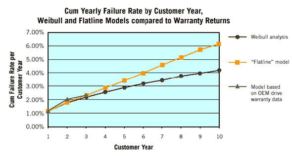 - Можно использовать информацию о гарантийном обслуживании из базы данных Seagate. Она позволит оценить соотношение накопителей, возвращенных на втором и третьем году эксплуатации, и устройств, в которых возникли сбои в течение первого года. Однако такие данные имеются только за первые три года эксплуатации — именно на этот срок распространяется действие большинства гарантийных обязательств Seagate на накопители для настольных компьютеров. Правда, серьезным преимуществом этого подхода является то, что все данные относятся исключительно к продукции Seagate для настольных систем.