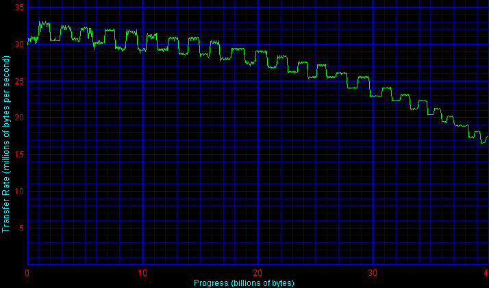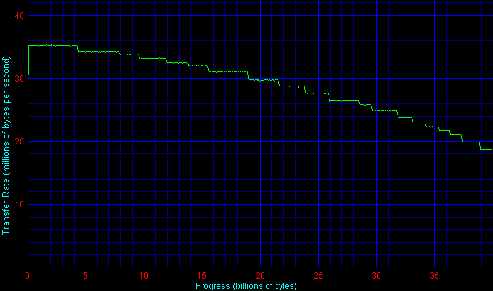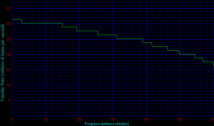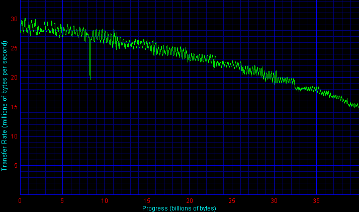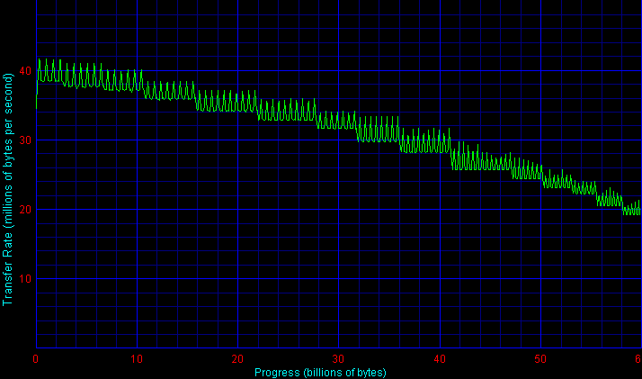 Прежде всего, здесь бросаются в глаза необычные «пляшущие» графики для дисков Hitachi и Samsung. Такие графики объясняются технологиями форматирования дисков, применяемыми в моделях данных серий — «адаптивного форматирования» в накопителях Hitachi серий Travelstar 80GN, 5K80 и 7K60/E7K60 (см. здесь; представители всех трех присутствуют в данном обзоре) и «эластичной плотности записи» в дисках Samsung (см. здесь; ранее такая эластичная плотность записи начала применяться в настольных винчестерах компании). Обе технологии по сути очень похожи друг на друга и исповедуют одну идеологию — каждый экземпляр накопителя индивидуально настраивается на заводе таким образом, чтобы обеспечить лучшую производительность и надежность. Для этого каждая пара «головка-поверхность пластины» собранного диска тестируется на определение характеристик быстродействия, и затем каждая сторона магнитной пластины индивидуально форматируется (размечается на дорожки и секторы) так, чтобы обеспечить наилучшие характеристики при работе именно с данной головкой. В результате, линейная плотность записи на каждой стороне каждой пластины может не совпадать с соседними (быть ниже или выше), что и приводит к таким графикам.